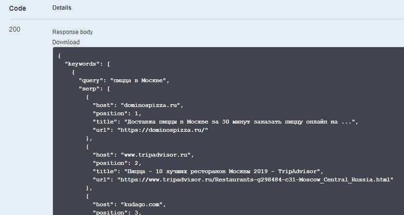Если запросов много, проверять придется долго. Для пакетной проверки есть Search API — он парсит топ выдачи Яндекс и Google вместе с рекламой, расширенными сниппетами и похожими запросами.
