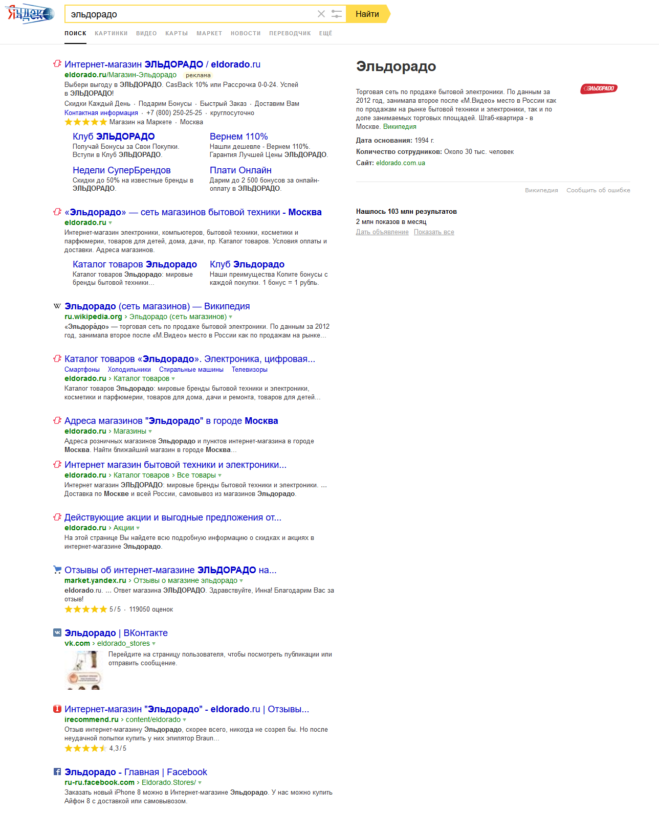 - ITR>100% — брендовый контекст обеспечивает значительный приток уникальных пользователей, опосредованно увеличивая число переходов из органической выдачи (амплификация). Как правило, амплификация становится следствием грамотного SEO- и SMM-продвижения вкупе с монополизацией спецразмещения и блока гарантированных показов. Одна из ярких иллюстраций — магазин электроники «Эльдорадо», который благополучно вытеснил всех конкурентов по брендовому запросу с главной страницы Яндекс, заняв, в том числе, Спектр: