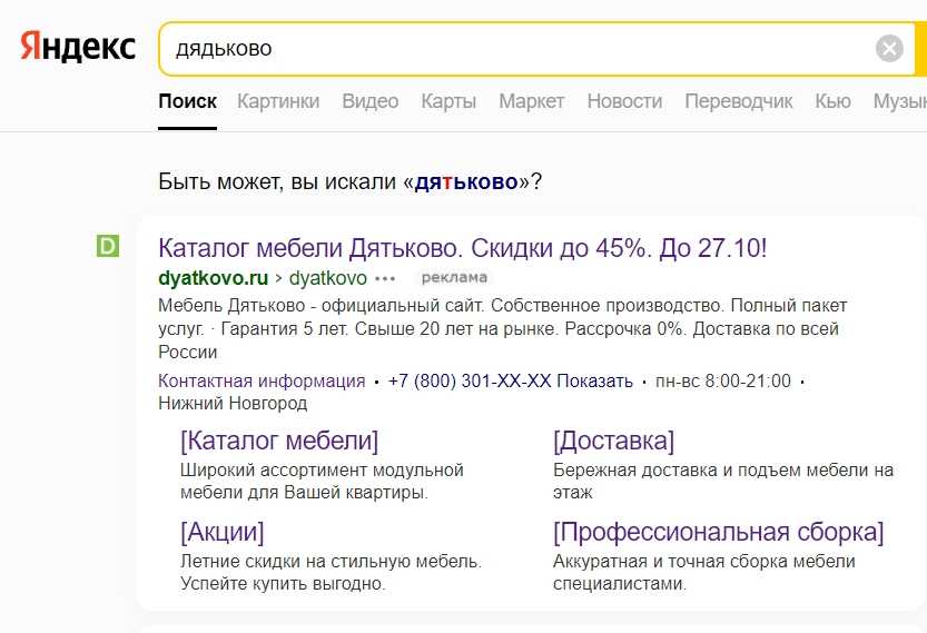 Название магазина «Дятьково» легко написать с ошибкой. Поисковик знает правильный запрос, поэтому предлагает исправление.