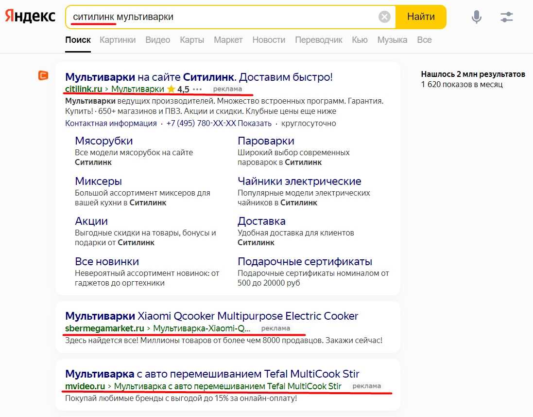 Сбермаркет и М.Видео рекламируются по запросу «ситилинк мультиварки». Ситилинк тоже запустил объявление, причем оно расширенное и занимает много места.