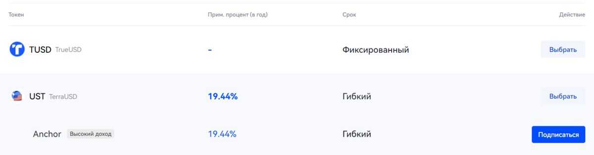 Плюс в том, что в стейкинг можно отправлять стейблкоины и получать по ним доход, в несколько раз больший, чем депозит в банке. Например, за стейкинг UST сейчас можно получить до 19% годовых.