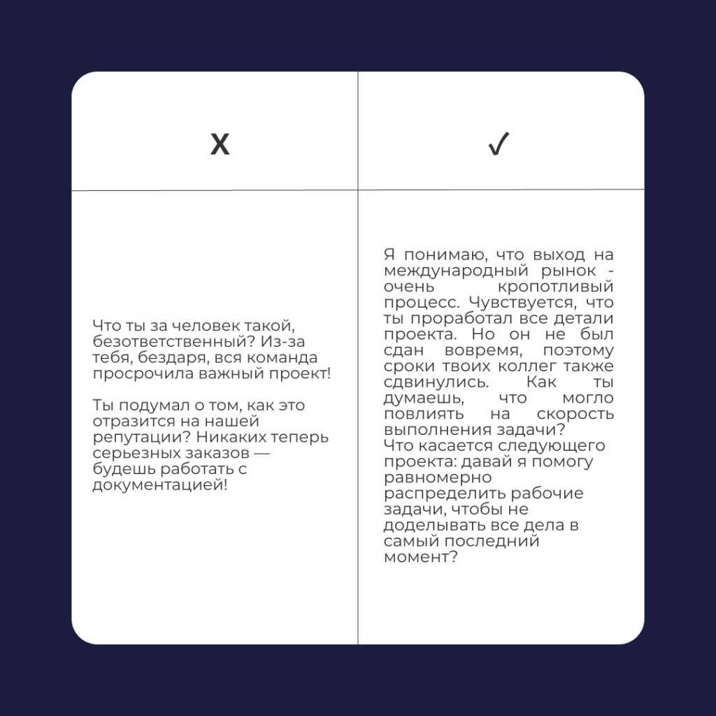 «Чтобы дать качественный фидбэк сотруднику, важно не только подобрать правильные слова, но и создать располагающую к комфортному диалогу атмосферу, — отмечает Евгения Филиппова. — Кроме того, не стоит давить на человека, высказываться негативно или обесценивать его труд, даже если он не принес желаемых результатов