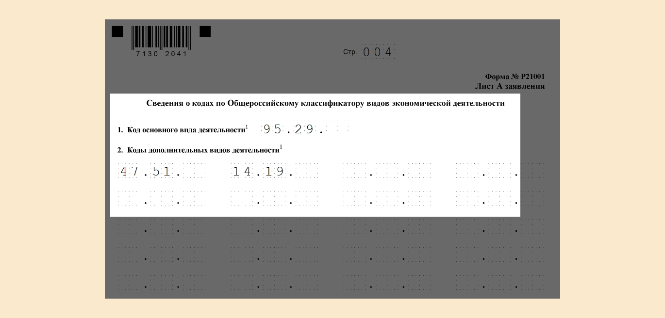 Василий сократил все выбранные коды до кодов группировок – так он автоматически откроет и другие близкие виды деятельности, без их уточнения в Р21001. Сначала Василий выписал все коды в блокнот, а позже, когда дело дошло до заполнения заявления, вписал их в поля на листе А формы Р21001.