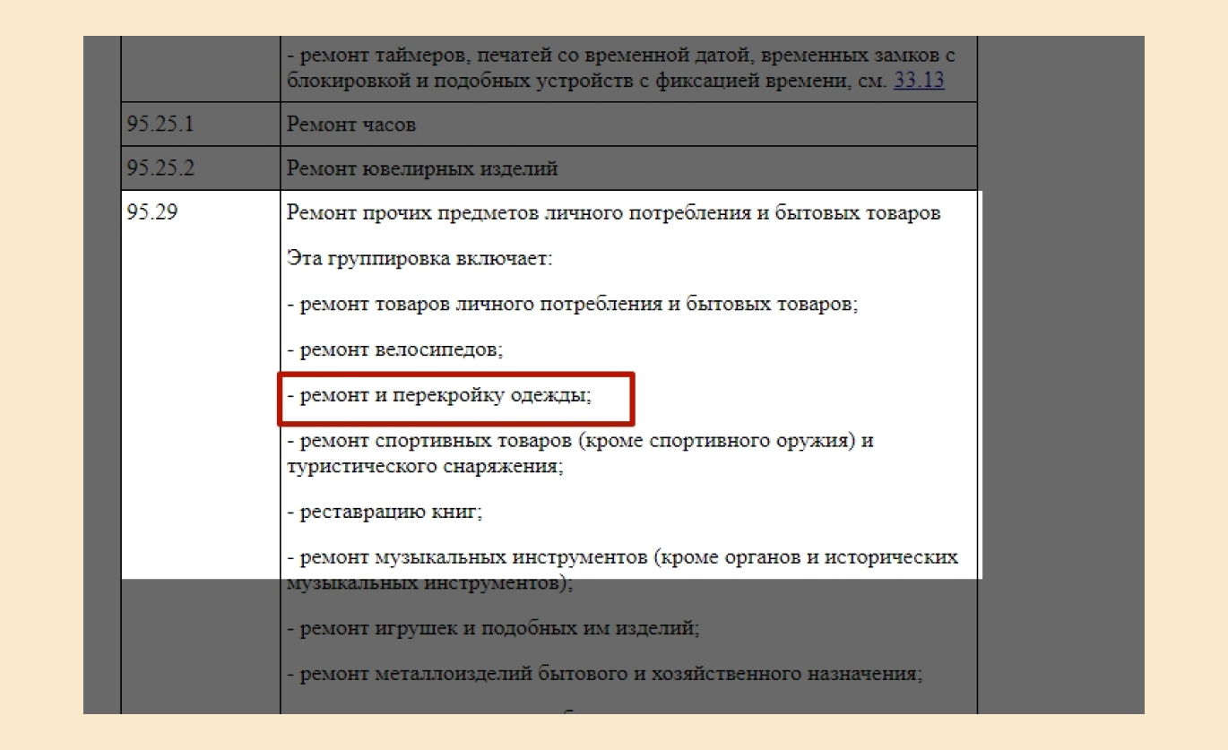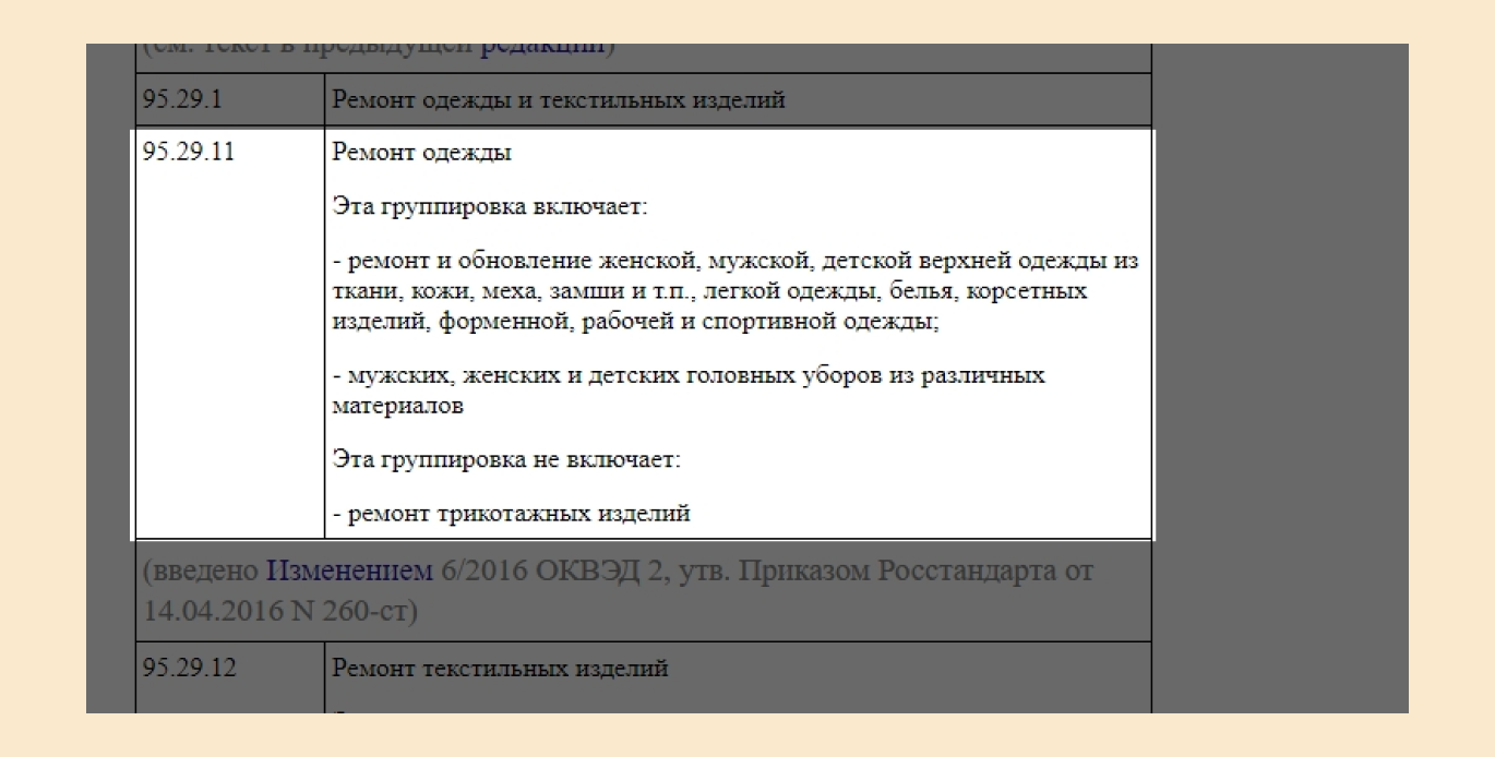 Еще ниже Василий нашел и нужный код: 95.29.11 «Ремонт одежды». Теперь Василий может указать этот код в заявлении в качестве основного.