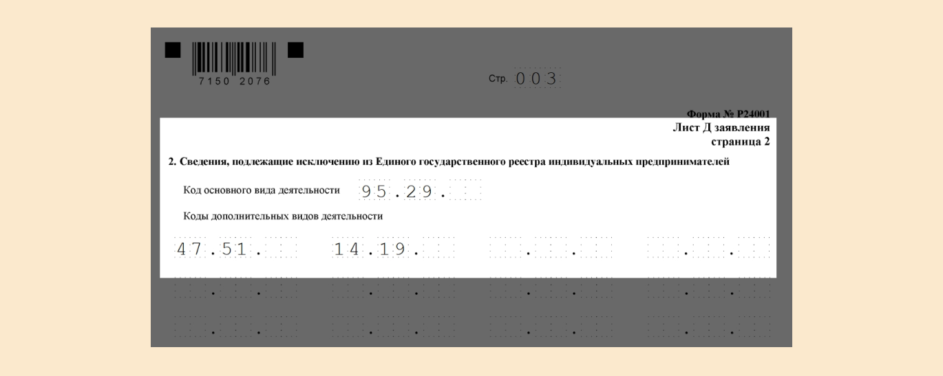 - на странице 2 – коды, которые хотим удалить из ЕГРИП.