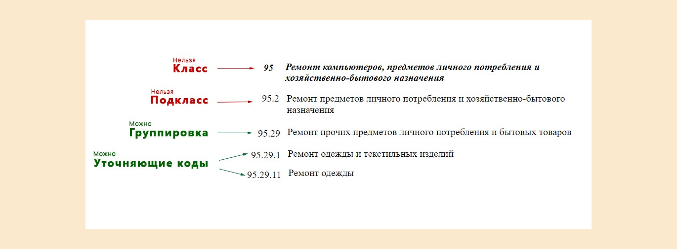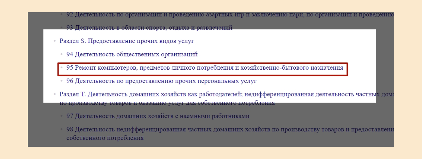 Василий занимается ремонтом одежды в своем ателье. Чтобы пройти регистрацию ИП самостоятельно, Василию нужно найти подходящий код ОКВЭД. Он посмотрел оглавление справочника и не нашел в нем раздела «Ремонт одежды». Зато в разделе «Предоставление прочих видов услуг» Василий нашел класс 95 «Ремонт компьютеров, предметов личного потребления и хозяйственно-бытового назначения».