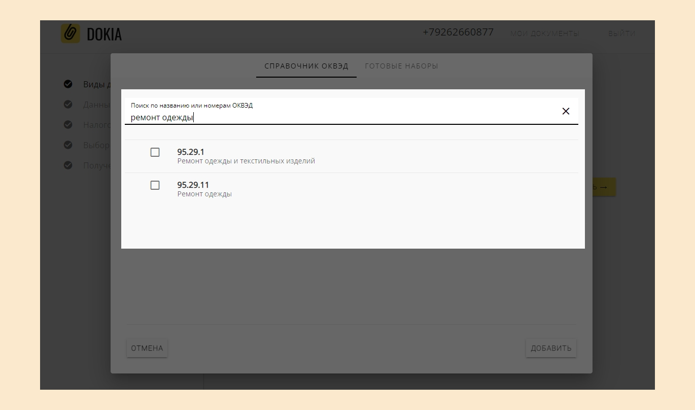 Кроме ремонта одежды, Василий планирует продавать пуговицы, молнии и нитки. А еще шить на заказ кожаные аксессуары – перчатки, ремни и пр. Ему нужно добавить еще 2 кода в заявление: