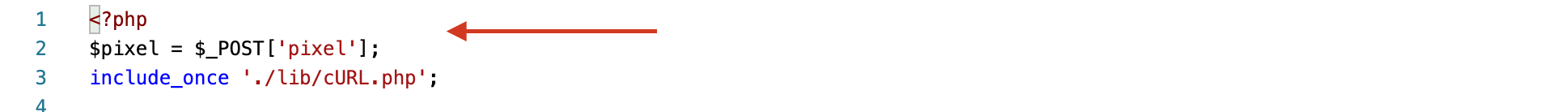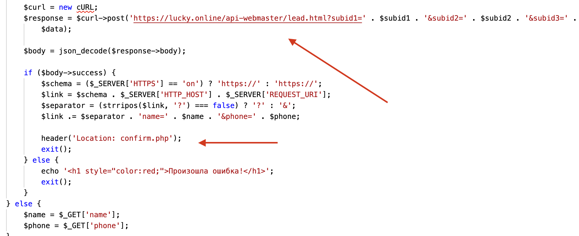 Так мы получим пиксель на оффере и отправим его на lucky.php. Далее, открываем lucky.php и получаем наш параметр в переменной