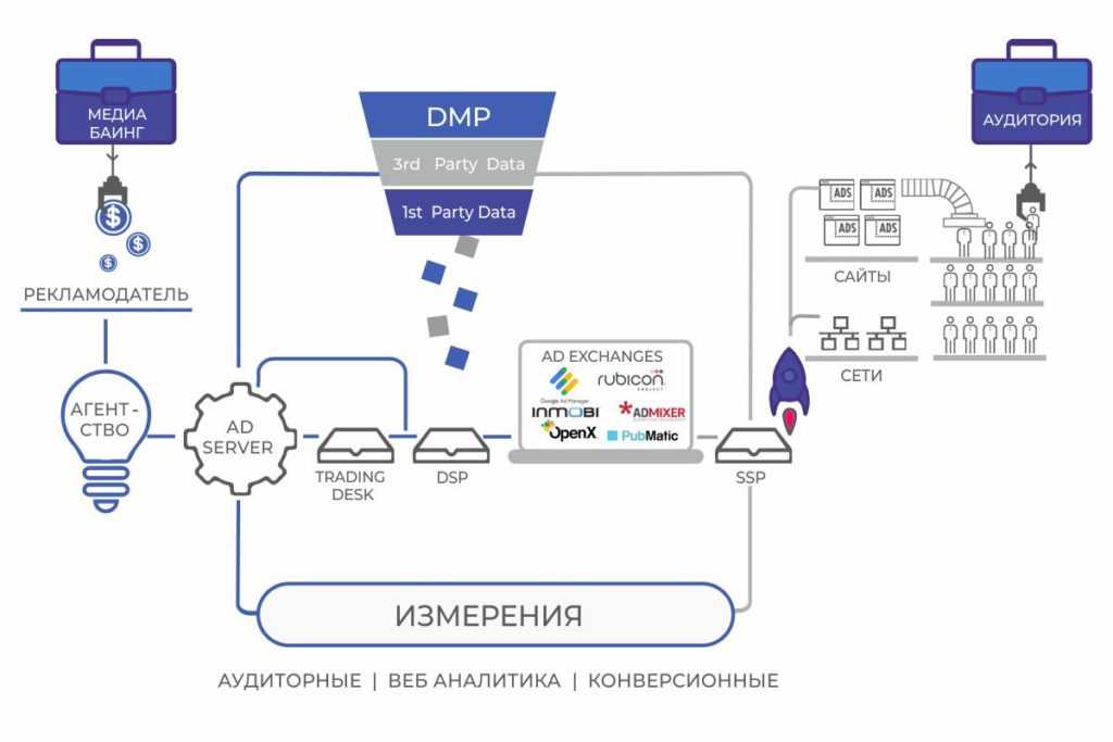 - DMP — платформа управления данными. Собирает данные об аудиториях, объединяет их, делит на сегменты, по которым можно закупать. Таргеты, которые можно использовать, хранятся на стороне DMP. Данные first party вы можете собрать сами.
