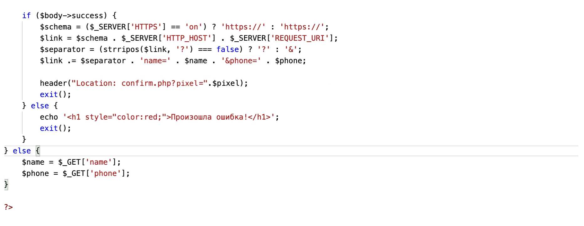 После чего открываем наш confirm.php и принимаем наш id пикселя сразу в код пикселя Facebook