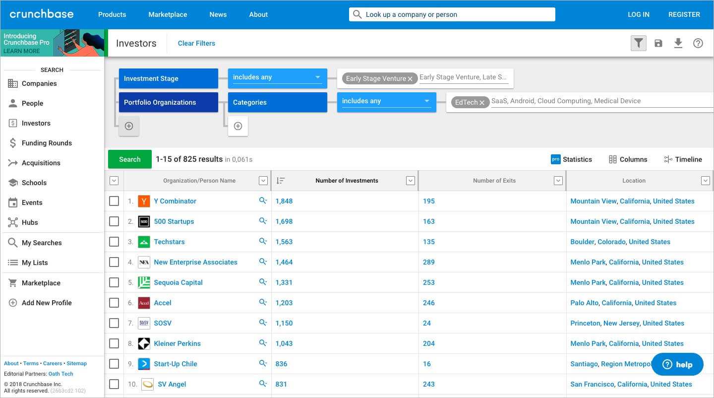 Скриншот Crunchbase — сайта о технологических трендах, инвестициях, стартапах и бизнесе; фильтр инвесторов по стадиям инвестирования и отраслям