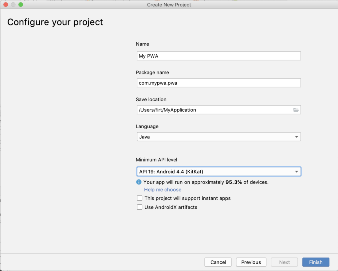 Заполните данные, выберите название проекта (мы его позже изменим) и имя пакета: это будет идентификатор нашего приложения в Android, а также в каталоге. Рекомендую использовать имя хоста в обратном порядке и произвольное название в конце. Например, если у вас хост , то пакет можно назвать com.mypwa.calculator.