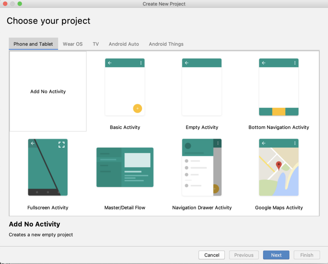Создайте новый проект в Android Studio и выберите No Activity: будем использовать только Trusted Web Activity из библиотеки поддержки.