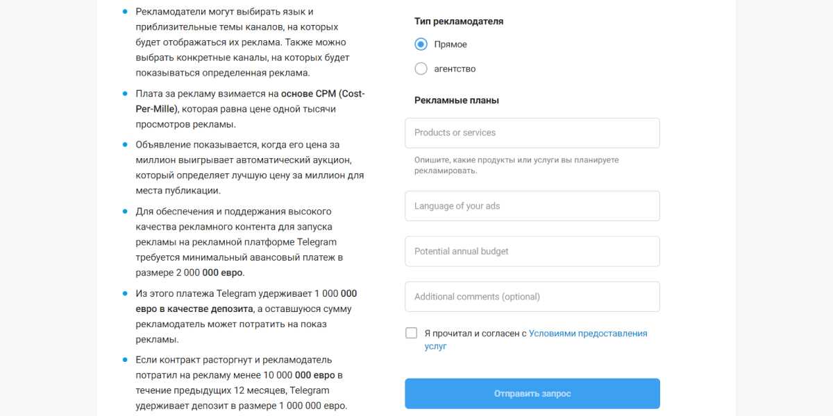 Затем нужно поставить галочку согласия с условиями обслуживания → «Отправить запрос».
