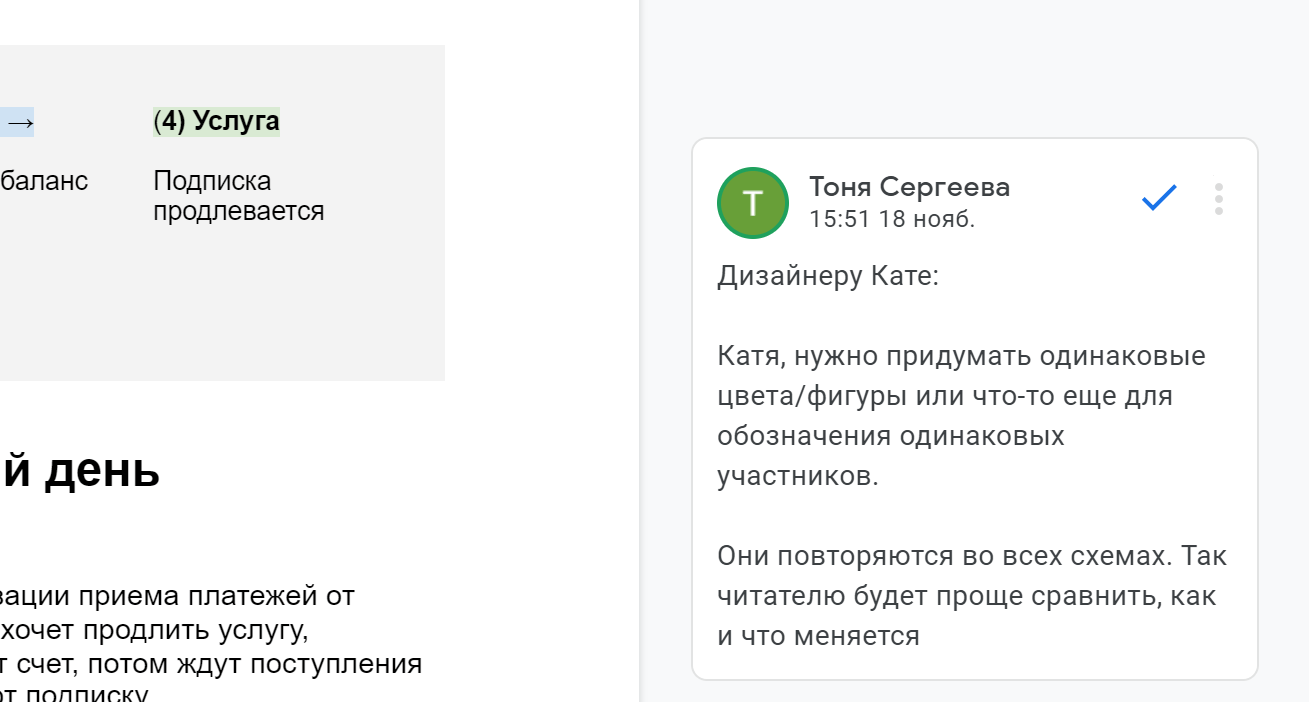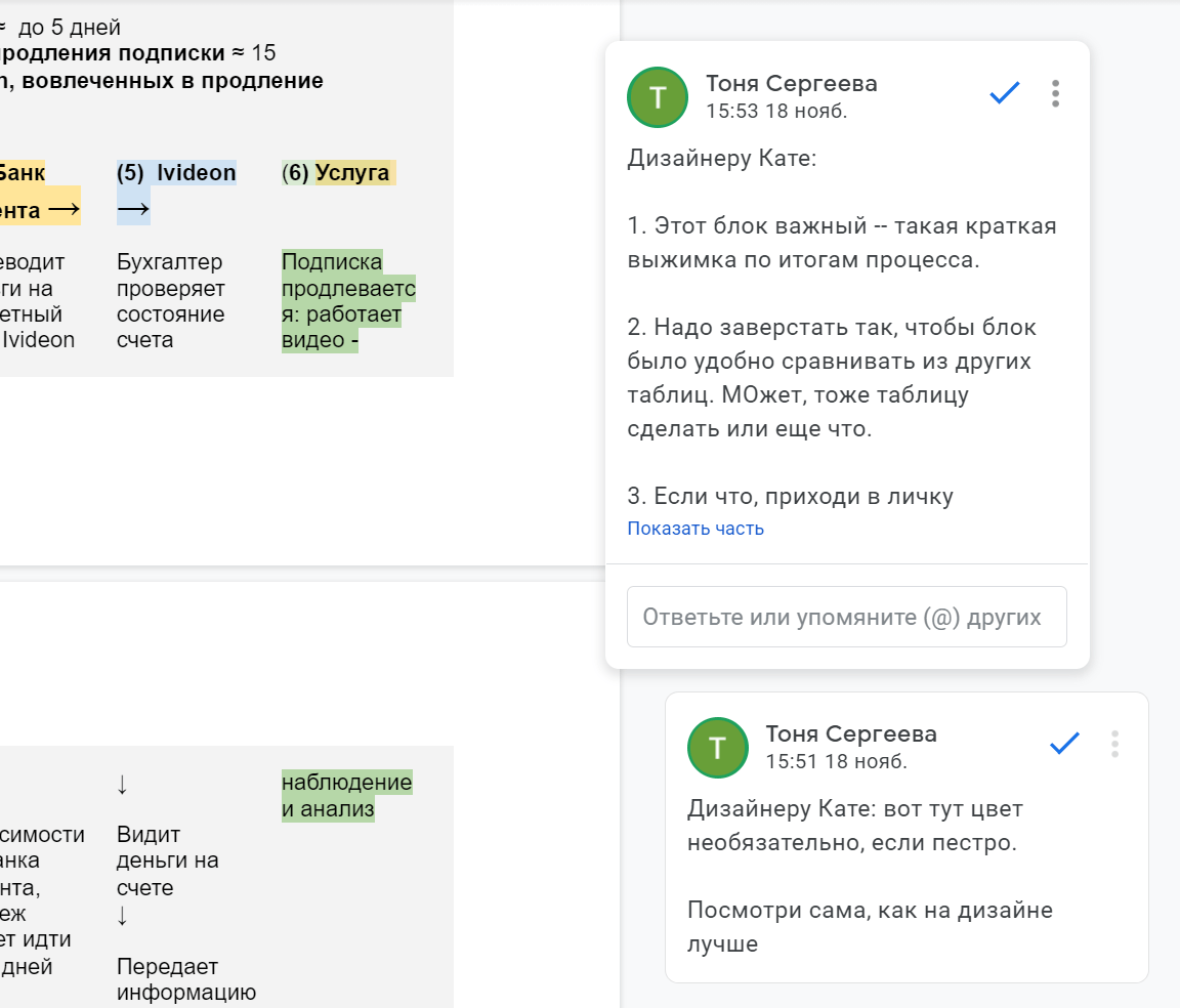 Чтобы дизайнеру было понятнее, оставила комментарии: что это такое и почему всё именно так, разметила цветом. Дизайнер отрисовал первую итерацию, мы обсудили, и он сделал остальное.