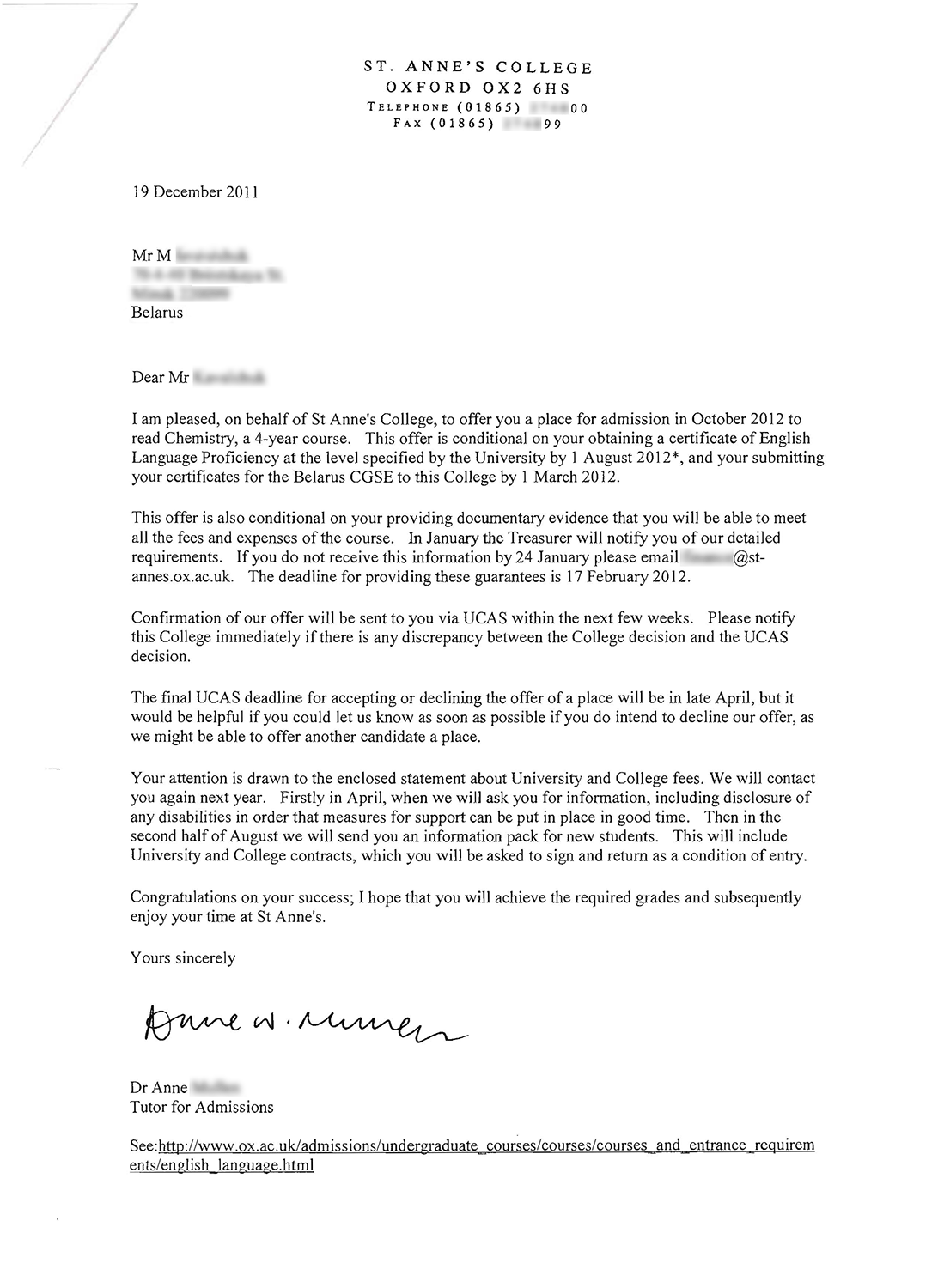 Через несколько дней после интервью мне на электронный адрес было выслано условное предложение (Conditional offer). Это фактически означало принятие меня в университет, но при условии выполнения некоторых требований. Помимо предоставления официальной копии аттестата, от меня требовалось предоставление необходимых результатов IELTS до 1 августа, а также предоставление гарантий платежеспособности. Если результаты экзамена по английскому языку зависели исключительно от меня (я готовился к сдаче IELTS летом), то получение стипендии представлялось куда более непонятным и субъективным этапом на пути из Минска в Оксфорд.