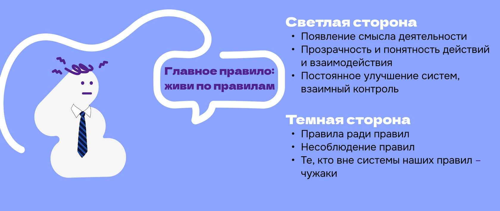 В организационном смысле подход примерно тот же: организация начинает описывать бизнес-процессы, появляются регламенты и правила. И на смену личному детищу собственника приходит система, которая подчиняется уже не только ему, но и правилам. И если правила качественные и живые — они двигают компанию вперед.Теперь про темные стороны. Основная — бюрократия. Когда вся жизнь компании становится ради правил, а не правила ради жизни. Есть забавная фраза: человек для системы, а не система для человека. Многие госкорпорации грешат этим. В развитии личности то же самое: убеждения и правила начинают преобладать над смыслом, и человек начинает задыхаться от собственной правильности.Итак, синий это про: