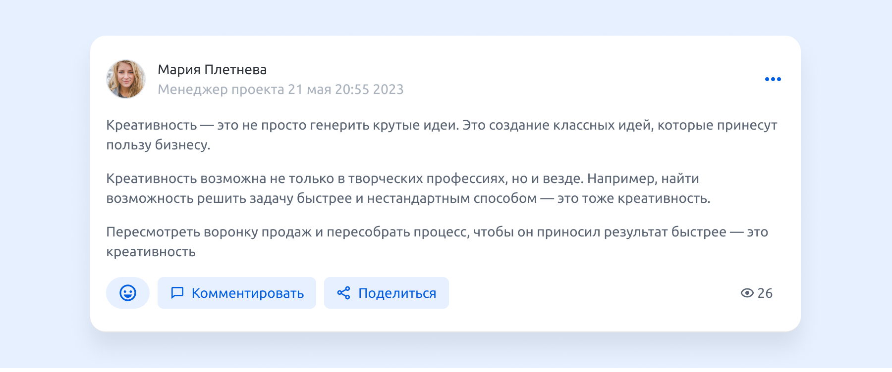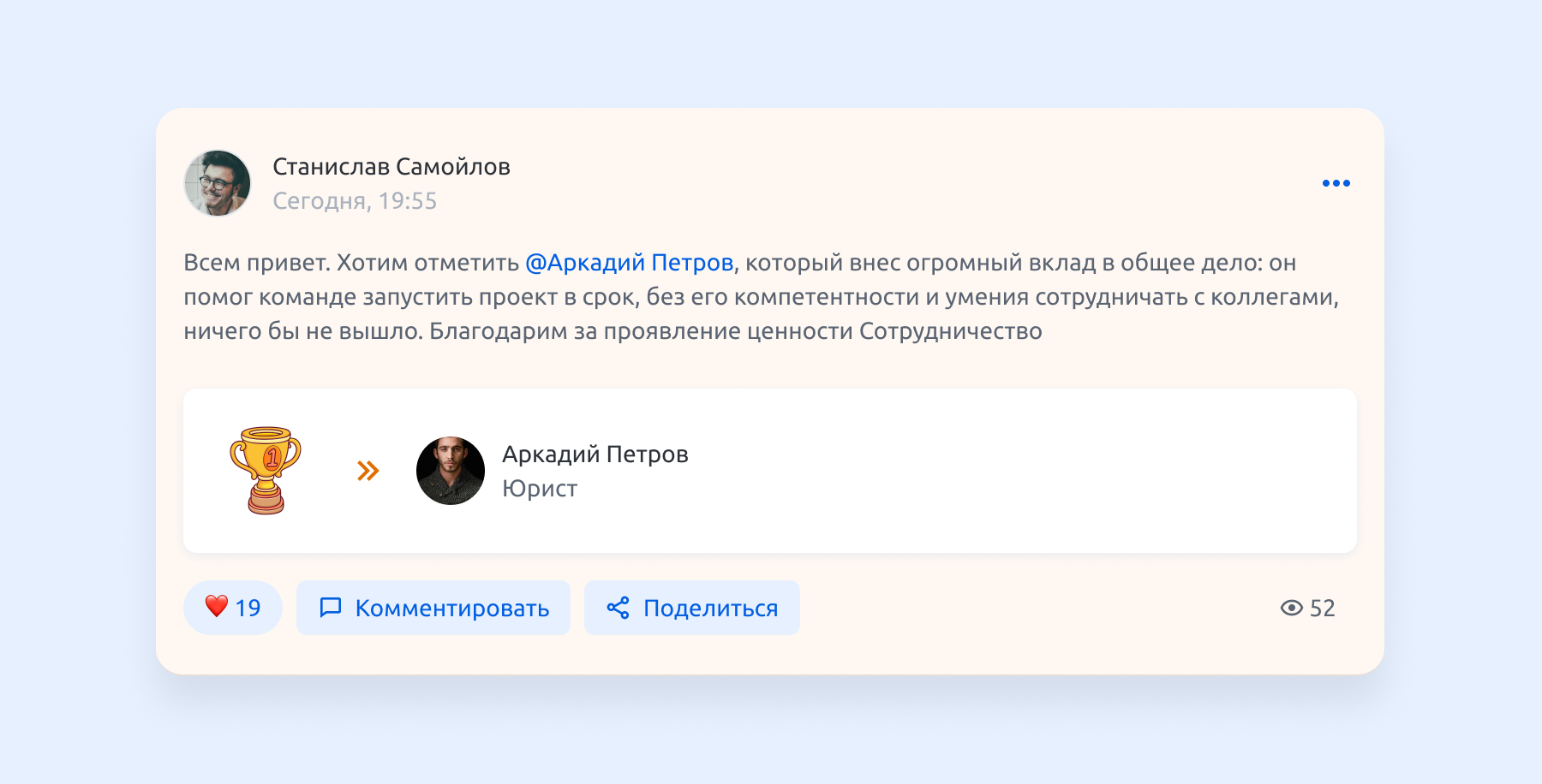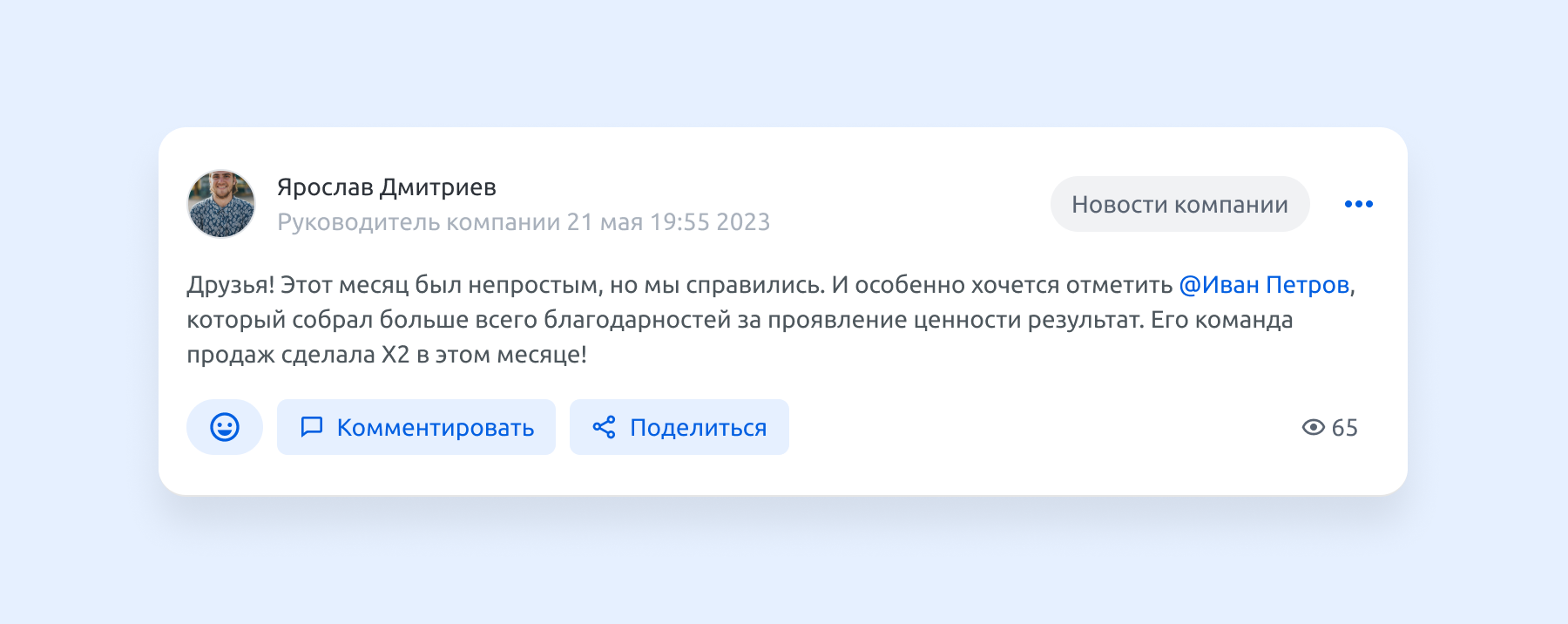 Другие сотрудники оставляли лайки и комментарии, усиливая эффект от признания. Был эффект от похвалы не только руководителя, но и всей команды.