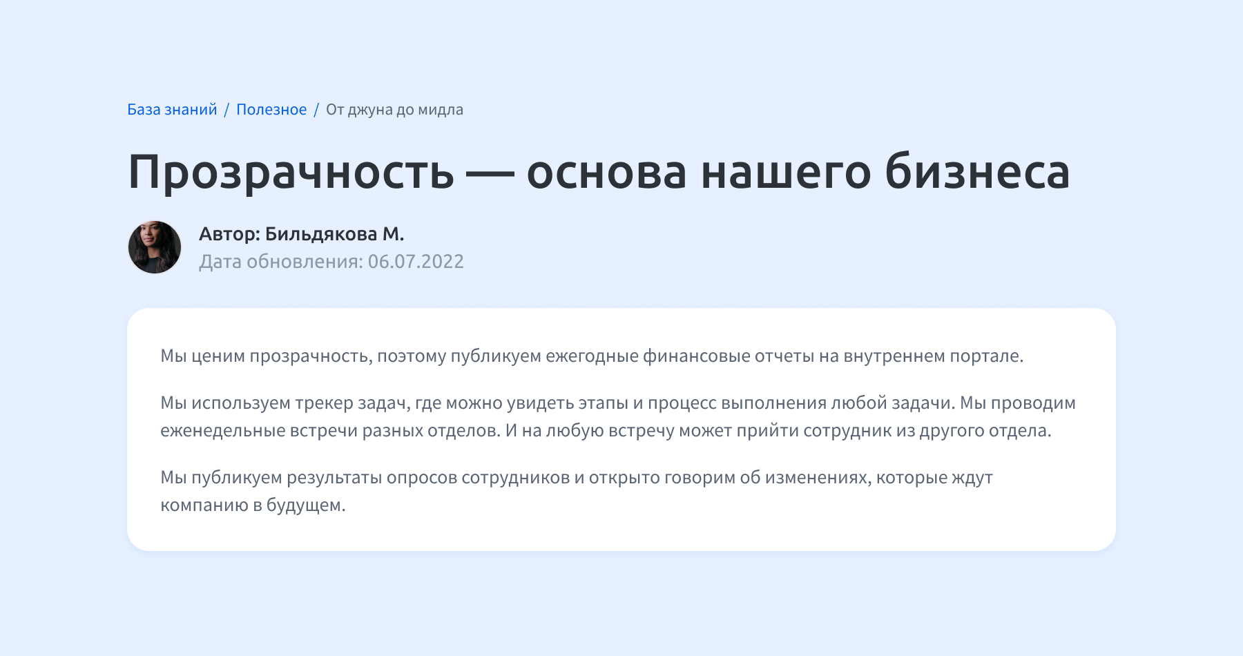 В корпоративной базе знаний появились статьи, которые объясняли новые ценности и желаемое поведение. Они вошли в адаптационную программу всех новых сотрудников.