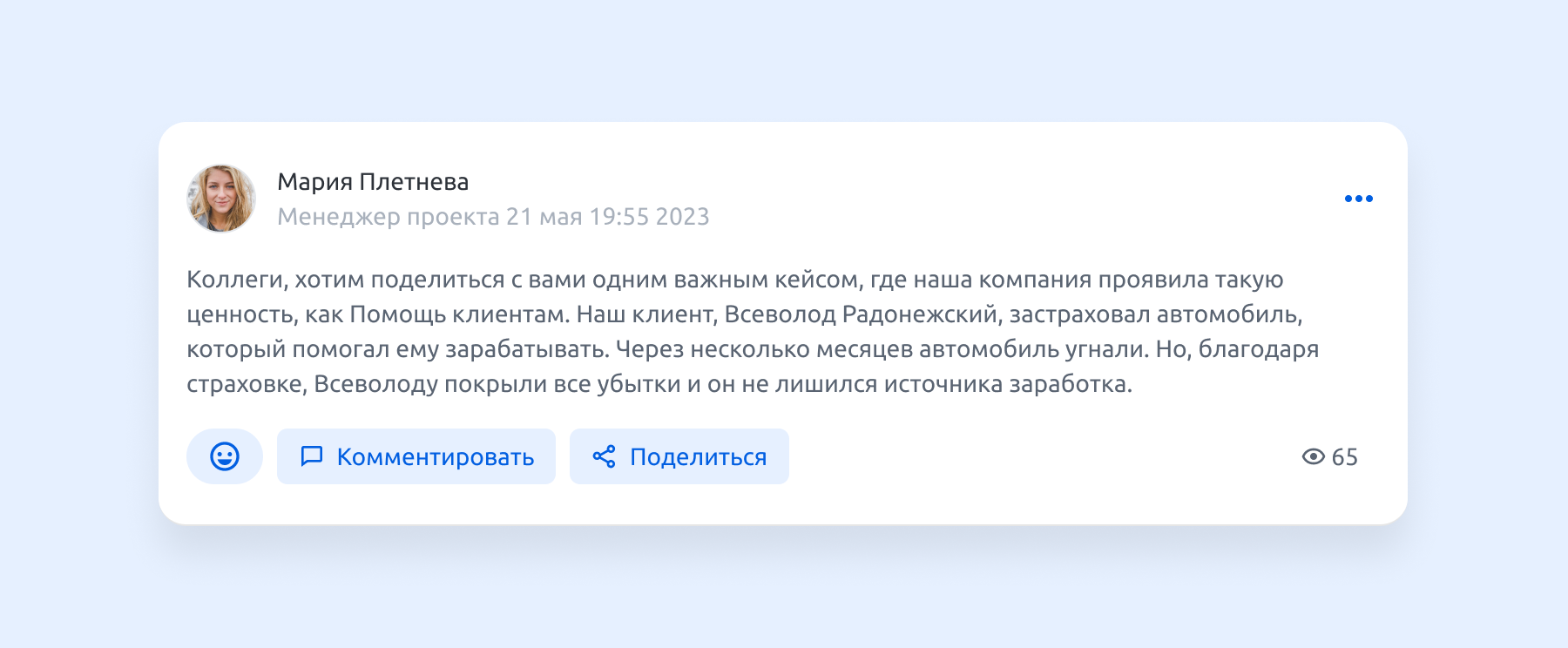 Поскольку компания занималась страхованием, а одной из ценностей была помощь клиентам, то раз в месяц был пост о том, как деятельность компании не просто давала возможность заработать денег акционерам, а помогала людям.