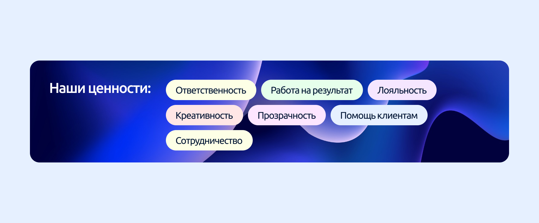 Были разработаны в корпоративном портале шапки с кастомным брендированным дизайном с перечислением ценностей.