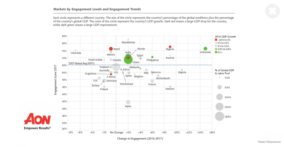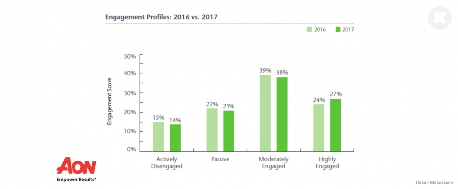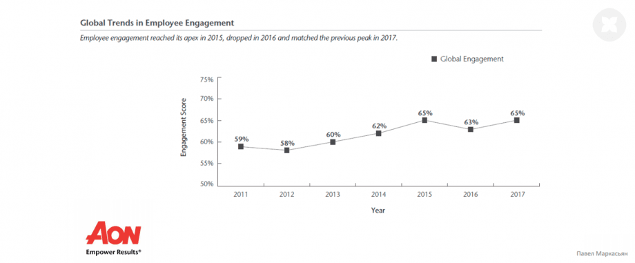 Компания Aon в 2017 году провела исследование и показала результаты изменения уровня вовлеченности по всему миру.