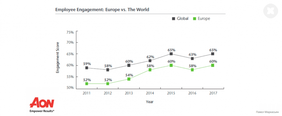 Компания Aon проводила исследование соотношения вовлеченности в Европе и во всем мире, в целом.