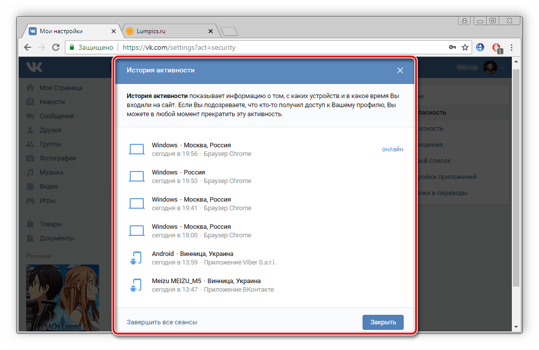 Еще одной очень популярной социальной сетью является ВКонтакте. Информация о расположении устройства, с которого было осуществлено подключение, находится примерно таким же способом, как и с ОК. Просто следуйте следующей инструкции: