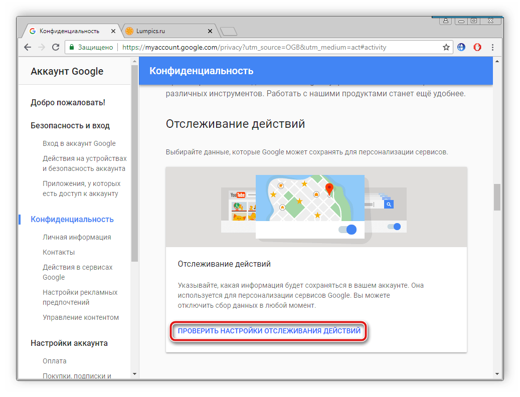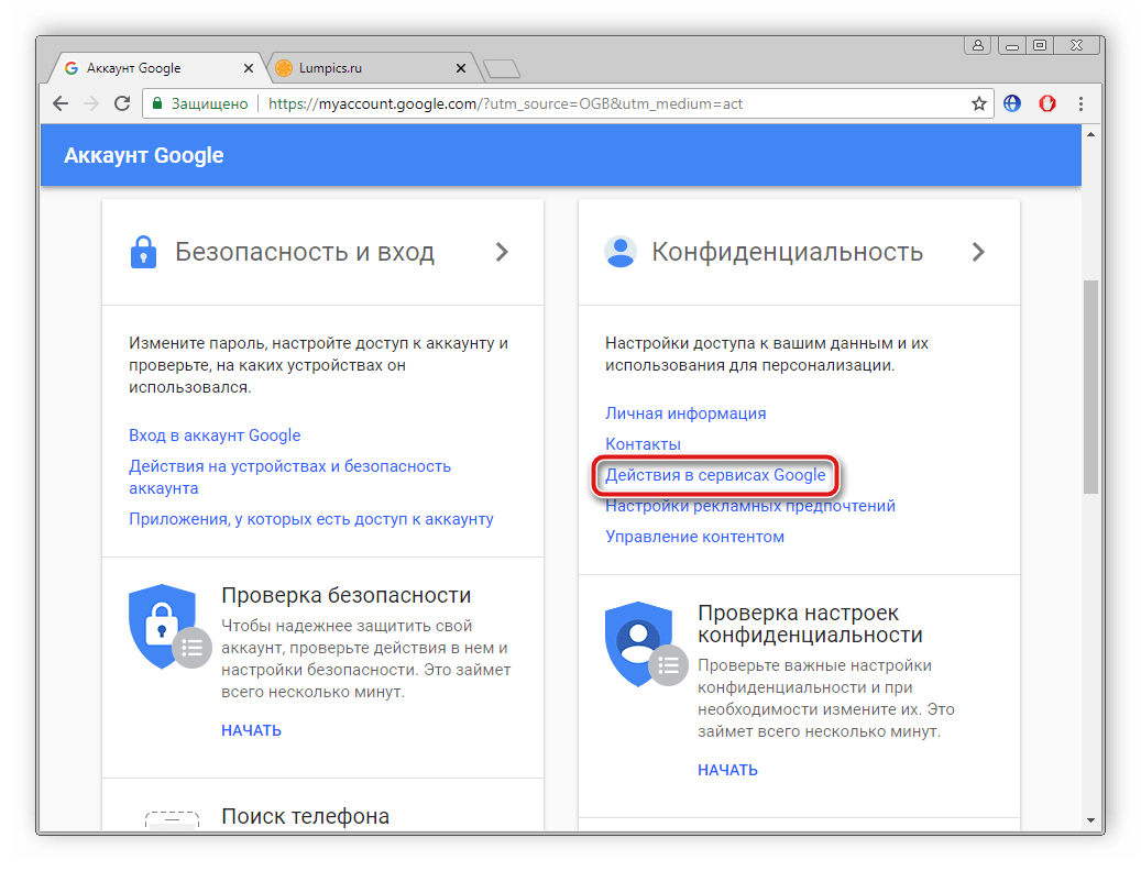 - Снова перейдите к настройкам аккаунта Google, в разделе «Конфиденциальность» выберите пункт «Действия в сервисах Google».