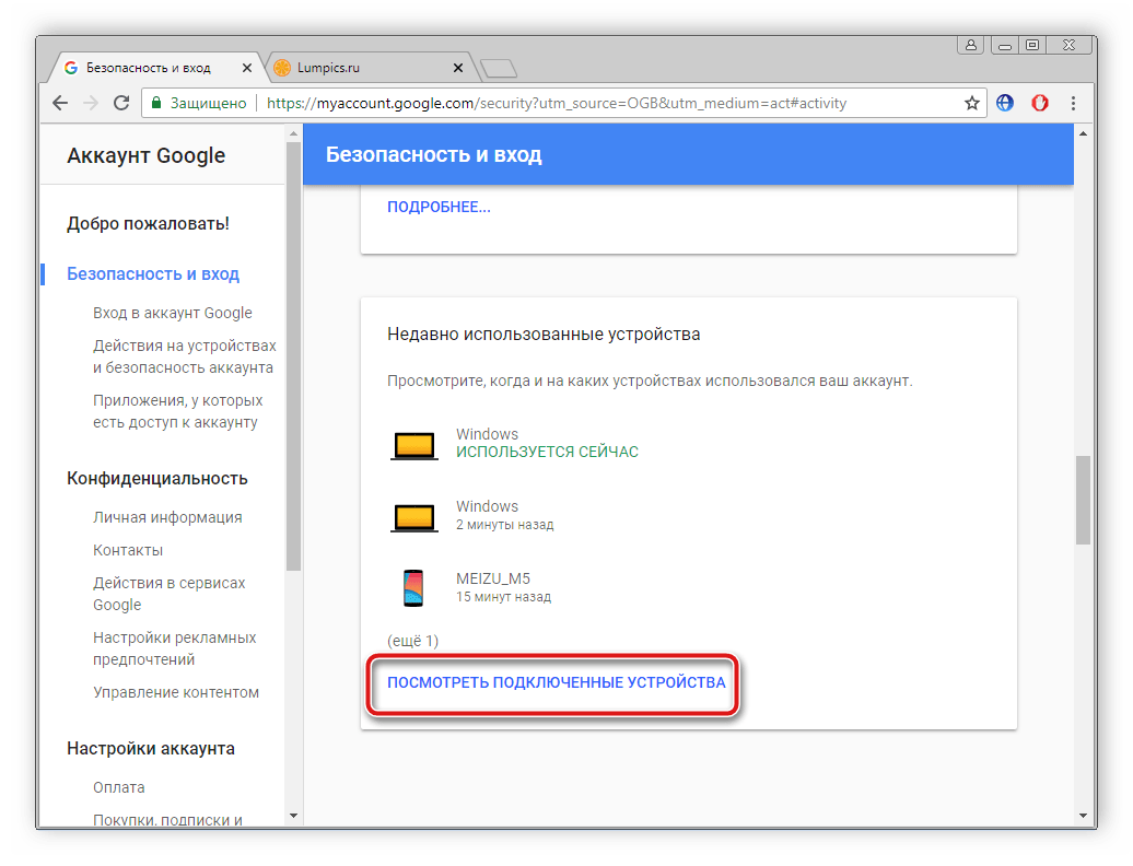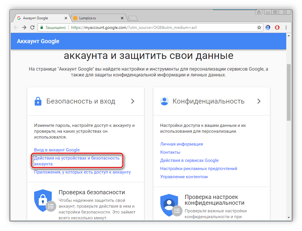 В разделе «Безопасность и вход» и выберите пункт «Действия на устройствах и безопасность аккаунта».