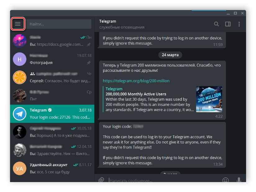 - Выполните вход в аккаунт, откройте меню нажатием на значок в виде трех вертикальных полос.