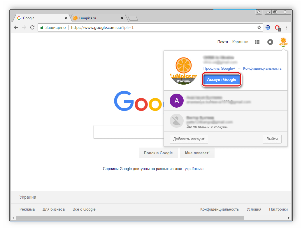 - Перейдите на официальную страницу Google, нажмите на значок своего профиля и кликните на кнопку «Аккаунт Google».