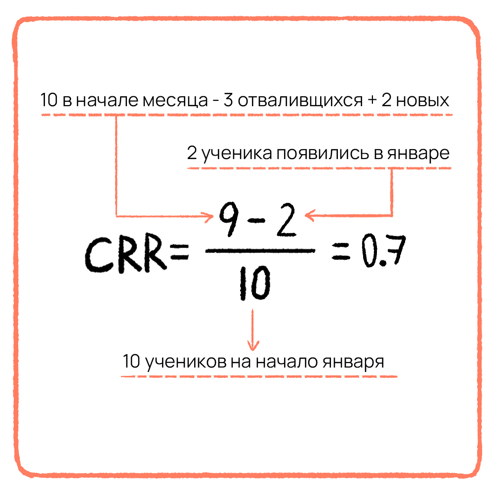 Например, у Аркадия в январе было 10 учеников. Трое к концу месяца отвалились, а двое новых появились. Определим CRR: