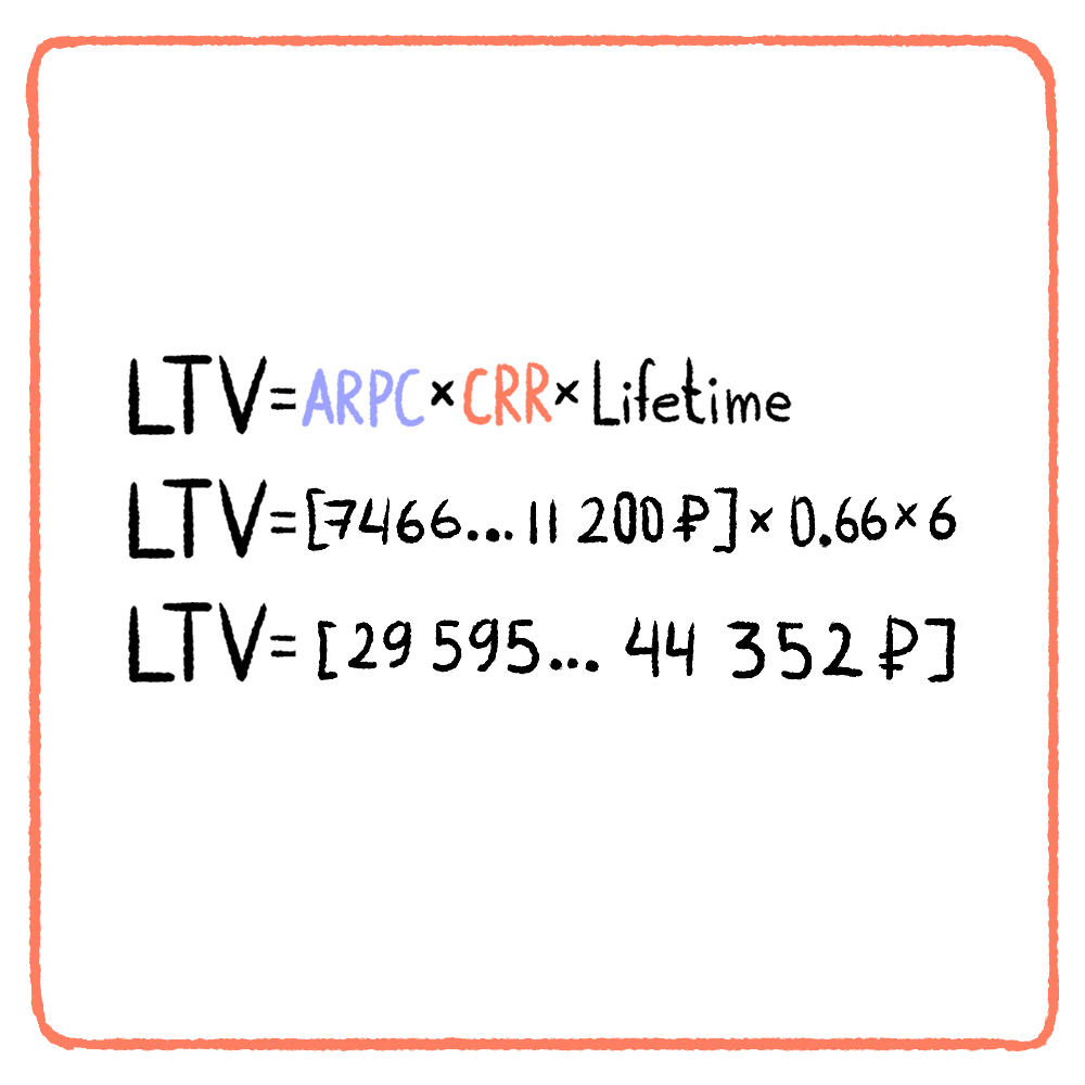 Для понимания логики определения LTV рассмотрим идеальный случай. Представим, что 15 учеников прозанимались с Аркадием весь год без перерывов на каникулы и праздники. Средний доход за месяц с каждого (ARPC) равен 7466 ₽. Значит LTV будет равен произведению ARPC и количества месяцев в году. Получится 89 952 ₽ с человека.