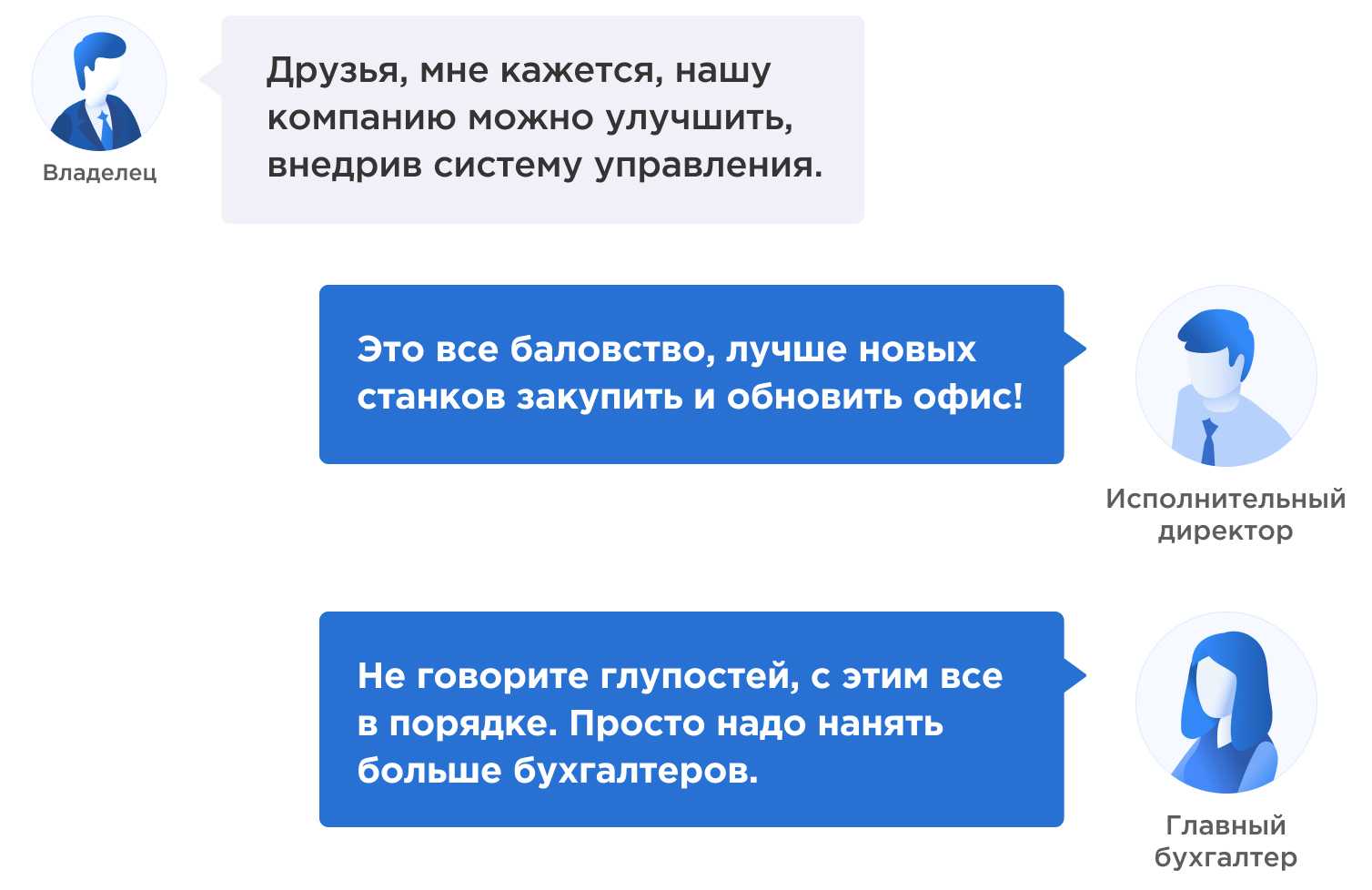 Система управления не заработает в такой компании, так как для ее внедрения требуется изменение точки зрения руководителей и сотрудников, и это не всегда гладко проходит. А если команда привыкла спорить и обесценивать владельца — шансов внедрить просто нет.