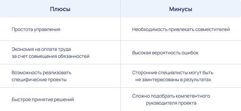 | Возможность быстрого получения результатов при ограниченных ресурсах. | Вся ответственность лежит на руководителе, что приводит к стрессу и перегрузкам. |