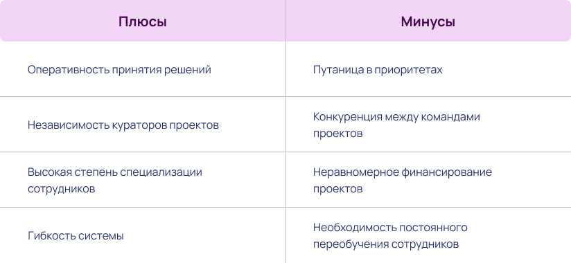 | Активная работа всех участников рабочего процесса, отсутствие ограничений в творчестве и генерации новых идей. | Подходит для небольших компаний, занимающихся творческой деятельностью. |
