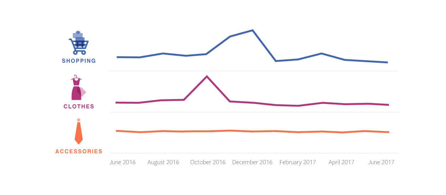 Исследователи из Facebook обнаружили, что пик обсуждений одежды и аксессуаров приходится на период перед Рождеством. Предполагалось, что разговоры будут активнее во время запуска новых коллекций. Но гипотеза не подтвердилась: в течение 2016-2017 года интерес к теме шопинга, одежды и аксессуаров оставался примерно одинаковым.