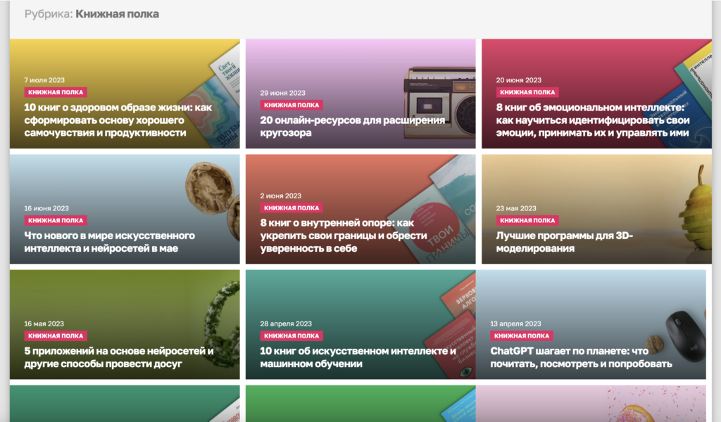 Отдельно вынесен раздел с рекомендациями, обзорами и выжимками из книг — в «Книжной полке» «Нетологии» публикуют отличные подборки литературы с комментариями экспертов и редакции.