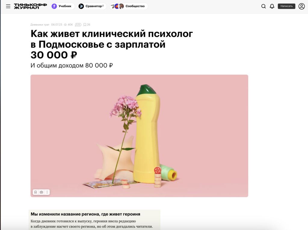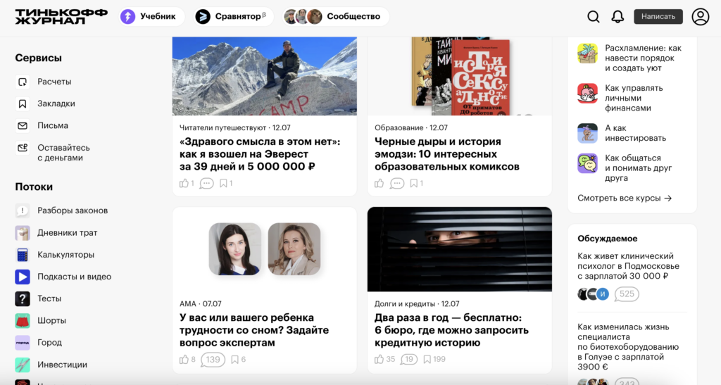 «Тинькофф—Журнал» — огромное издание от одноименного банка, ежемесячная аудитория блога составляет 14,7 млн пользователей. Позиционируется как журнал про деньги, но на самом деле редакция пишет на огромное количество тем: от экономии и разводов до строительства дачи, выбора ресторанов, косметики и путешествий.
