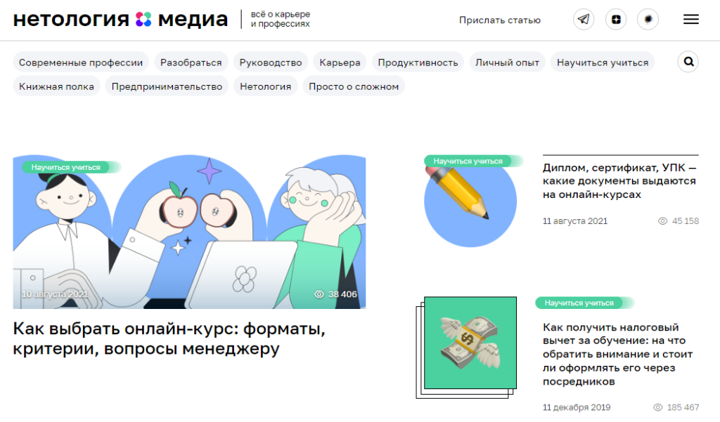 О чем пишут в блоге. Главная тема издания — современные специальности, карьера, продуктивность и предпринимательство. Есть и другие рубрики: «Руководство» и «Разобраться» с полезными инструкциями на все случаи жизни, разборами законов, трендами на рынке и исследованиями. Однако, в отличие от Skillbox, «Медиа Нетологии» больше сосредоточено на образовании и карьере.