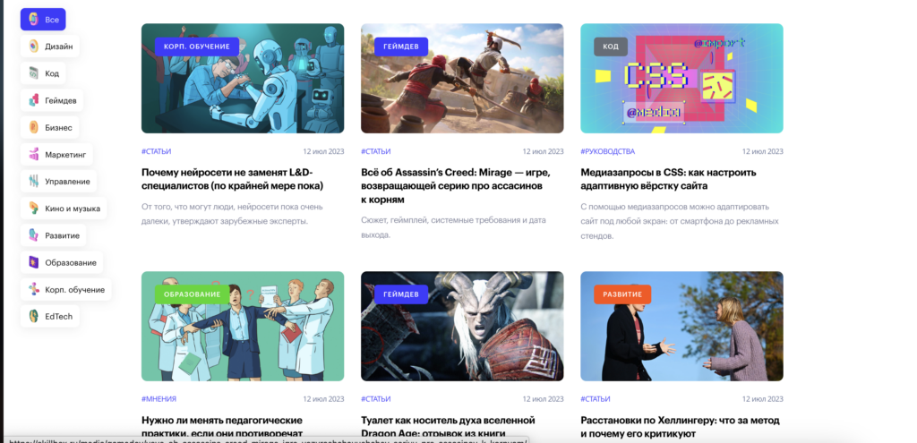 О чем пишут в блоге. В Skillbox Media представлен широкий спектр тем: от управления, корпоративного обучения, геймдева, маркетинга, дизайна до кино, психологии и организации пространства. В блоге освещаются новости каждой из отраслей, а упор сделан на полезный и практический контент: подборки, how-to, обзоры и инструкции.Спецпроекты и интересные рубрики. В журнале можно найти много обзоров различных профессий — редакция рассказывает, как прийти в профессию, сколько зарабатывает специалист и какие перспективы есть у сотрудников. Кроме того, среди статей часто встречаются кейсы и личные истории учеников, которые закончили курсы Skillbox.