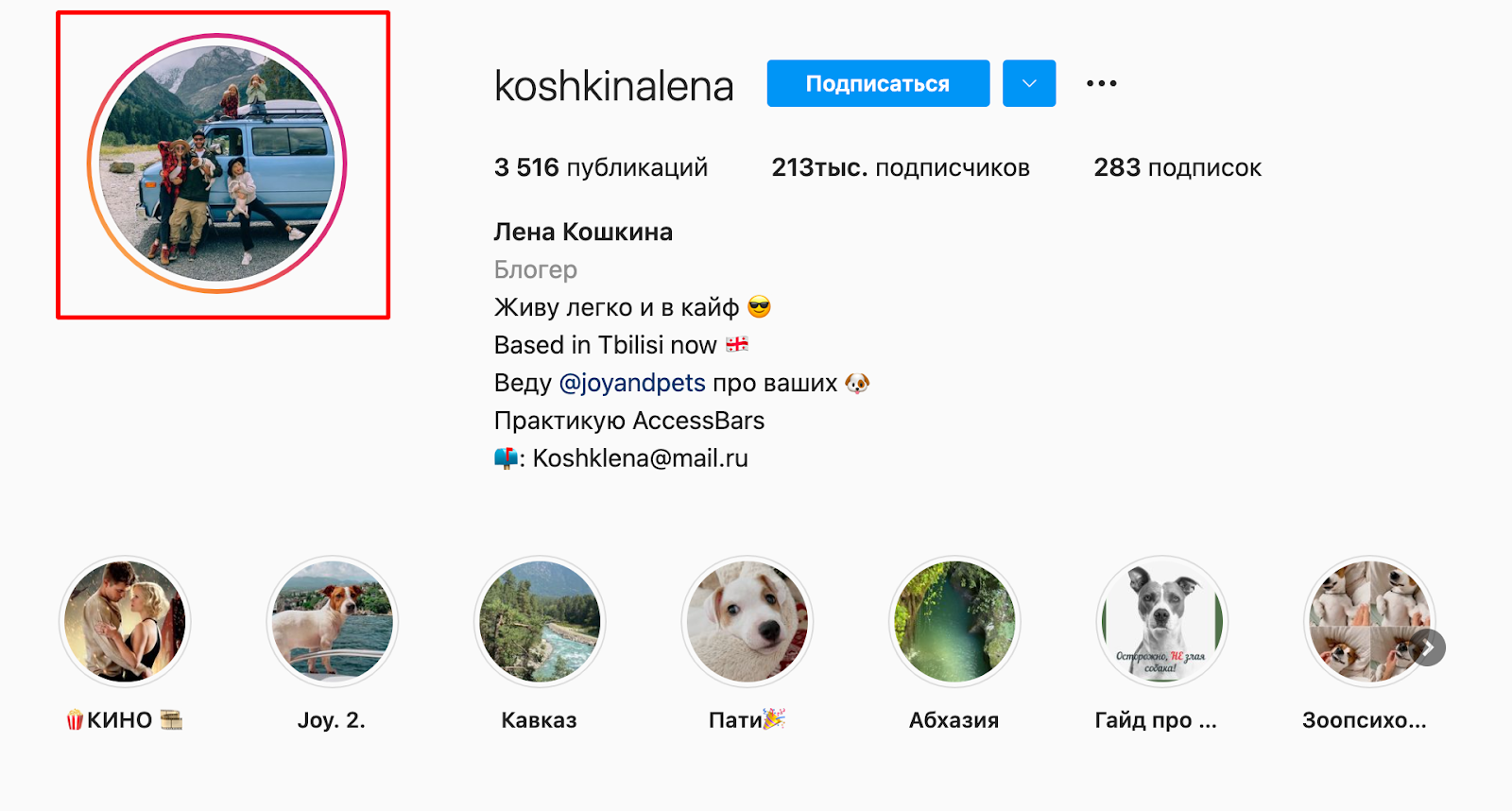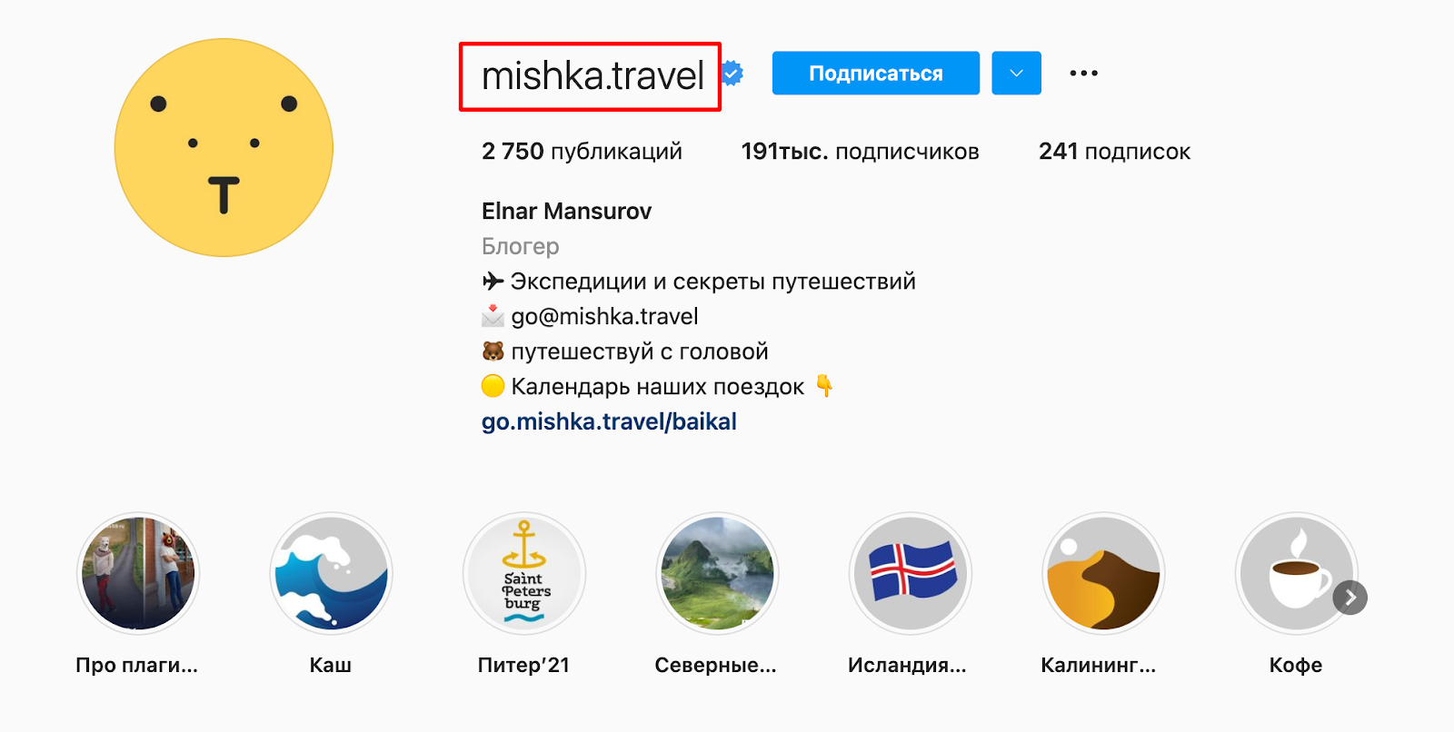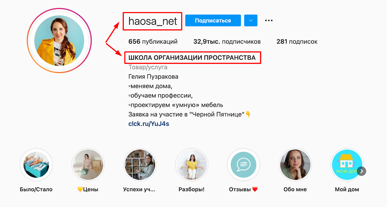 В описании профиля указываем самую важную информацию — имя (для личного блога), сферу деятельности, геолокацию или достижения, а главное — рассказываем о том, что пользователь увидит в вашем аккаунте и указываем ключевые темы.