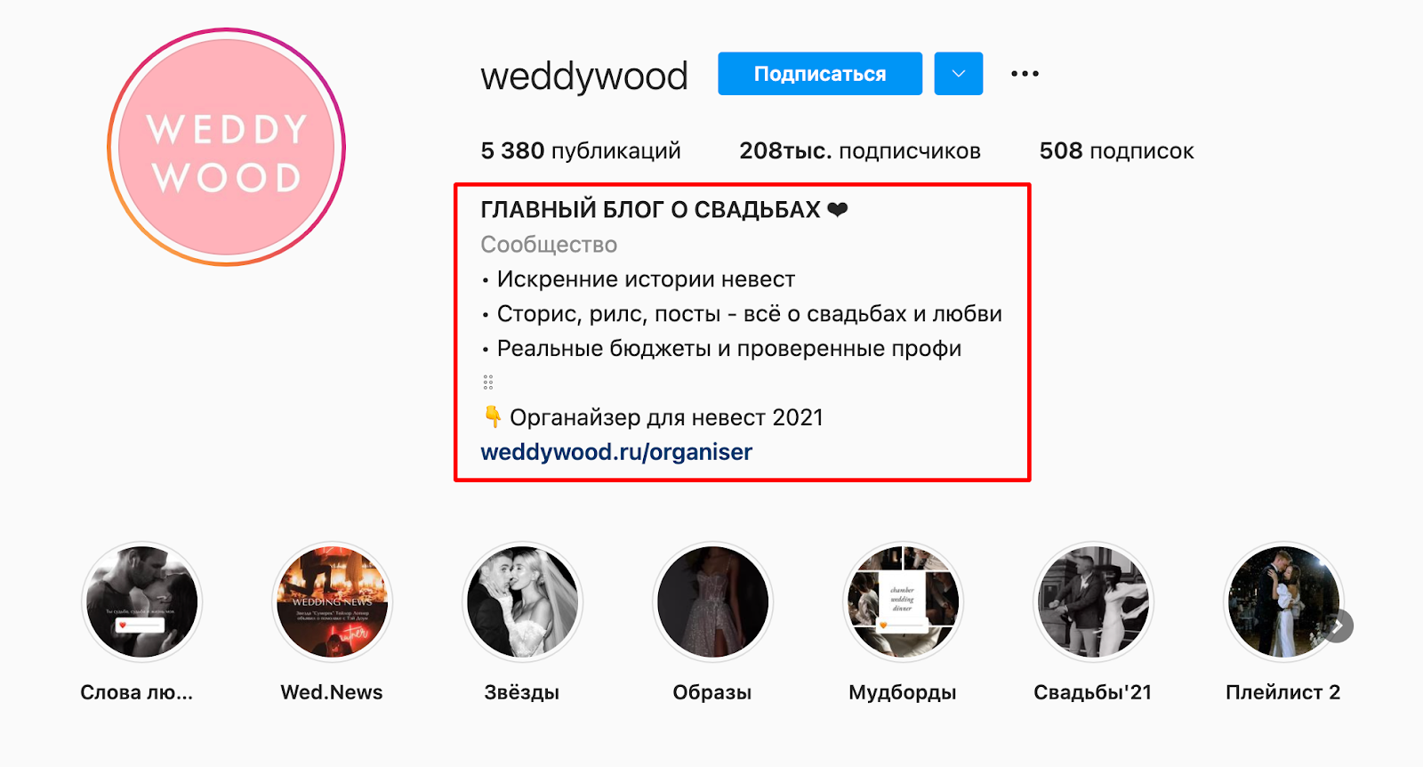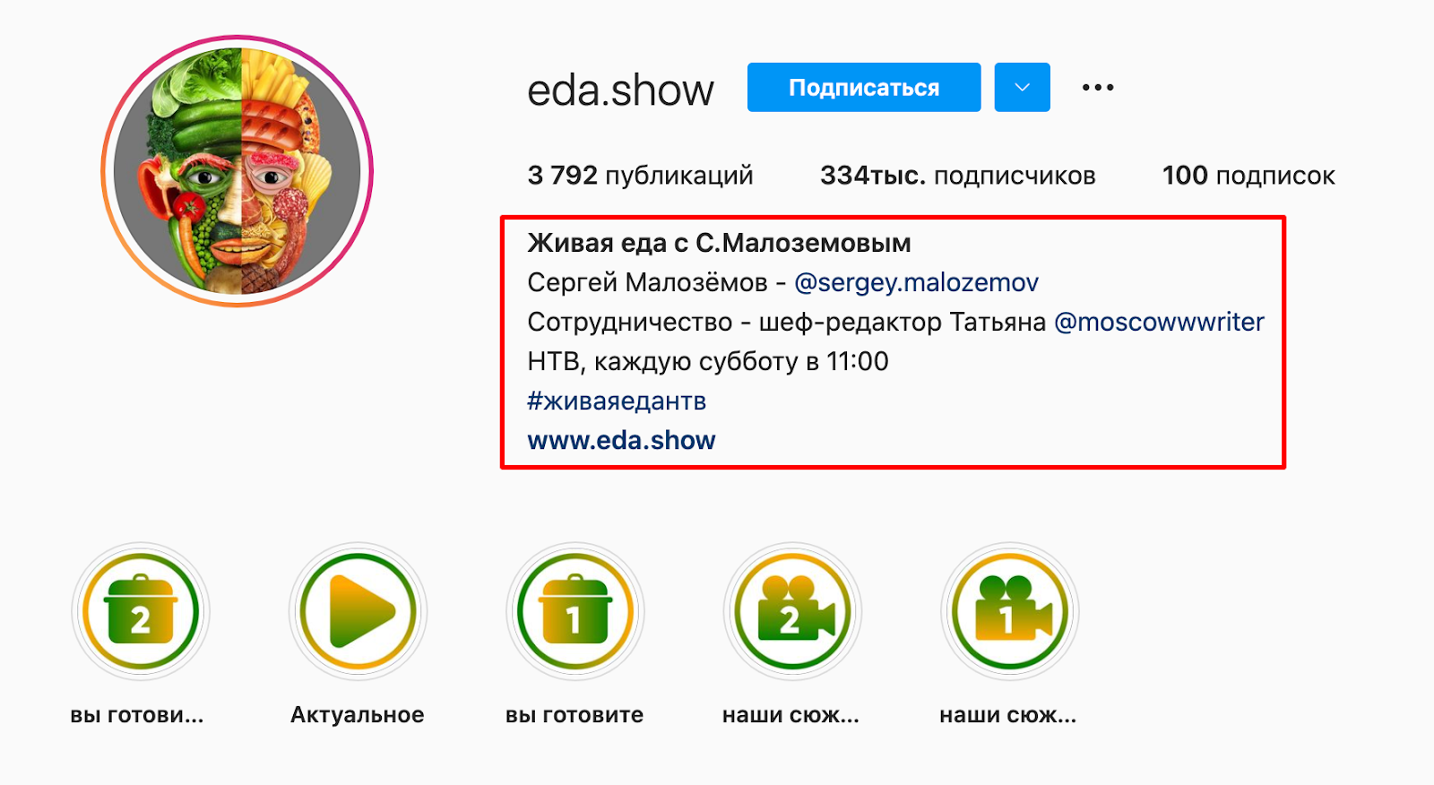 Видна в верхней части аккаунта в инстаграме, содержит краткую информацию о владельце и его роде деятельности.