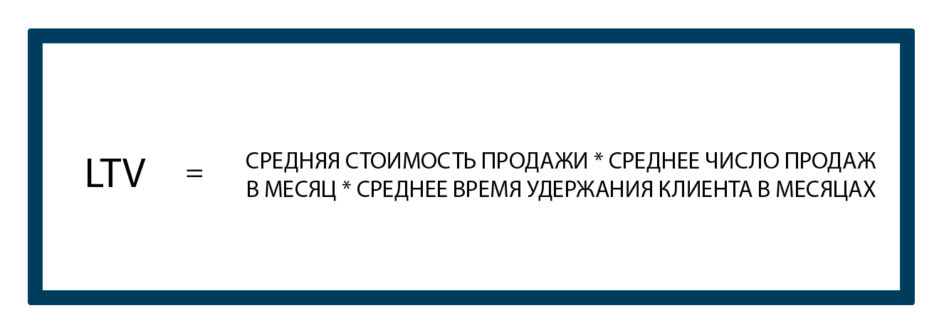LTV =(средняя стоимость продажи) х (среднее число продаж в месяц) х (среднее время удержания клиента в месяцах)
