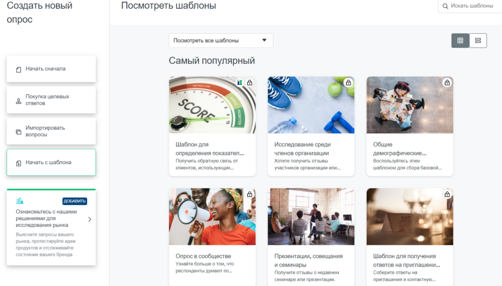 Survey Monkey — платформа, на которой есть бесплатный доступ с возможность создать 1 опрос на 100 респондентов: небольшим компаниями и физическим лицам этого хватит, чтобы собрать мнение людей. В сервисе есть встроенный конструктор опросов с готовыми шаблонами, по которым можно без заморочек создать свою анкету. Если возникнут трудности — вам поможет поддержка Survey Monkey.