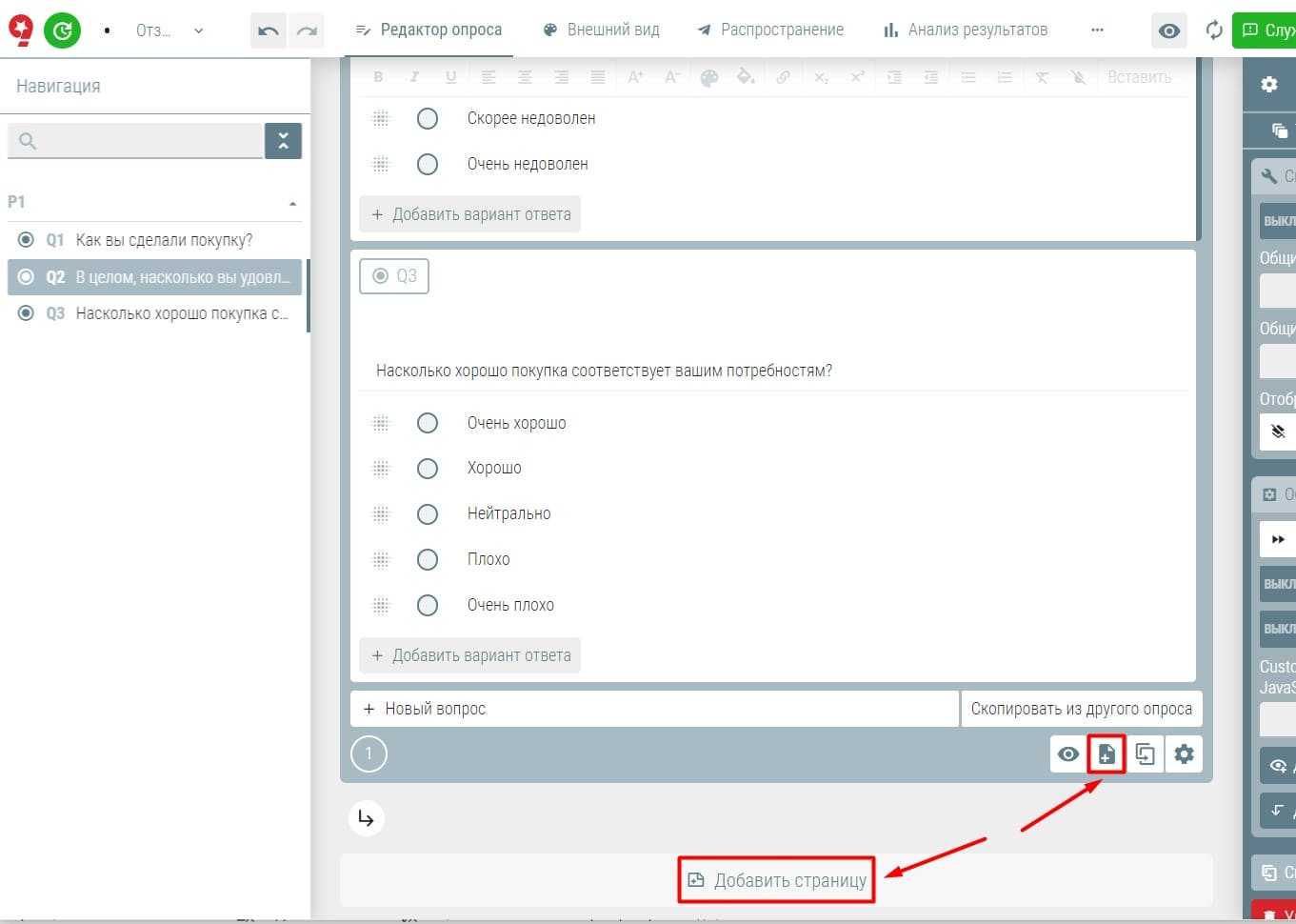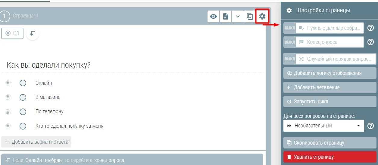 Добавить ветвление – настройки перехода от текущей страницы в зависимости от ответов респондента.