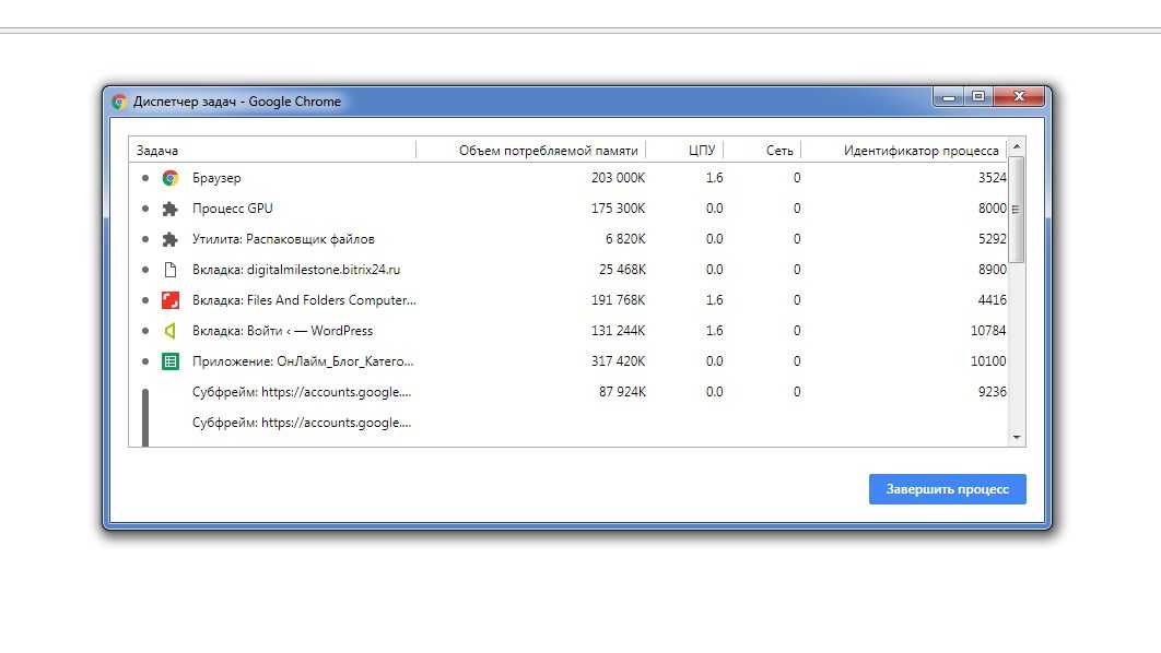 Если ваш компьютер начал притормаживать из-за огромного количества вкладок, а закрывать их не хочется, чтобы не прерывать работу, то Chrome предлагает воспользоваться следующим вариантом — частичной очисткой памяти с помощью менеджера задач. Нажмите сочетание клавиш Shift+Esc, и откроется окно встроенного диспетчера задач. Здесь вы увидите, какие из сайтов в ваших вкладках отнимают много памяти и, как следствие, тормозят работу. Отсортируйте сайты по размеру потребляемой памяти и завершите ненужные в данный момент. Таким образом, все вкладки останутся на своих местах, а работа устройства ускорится.