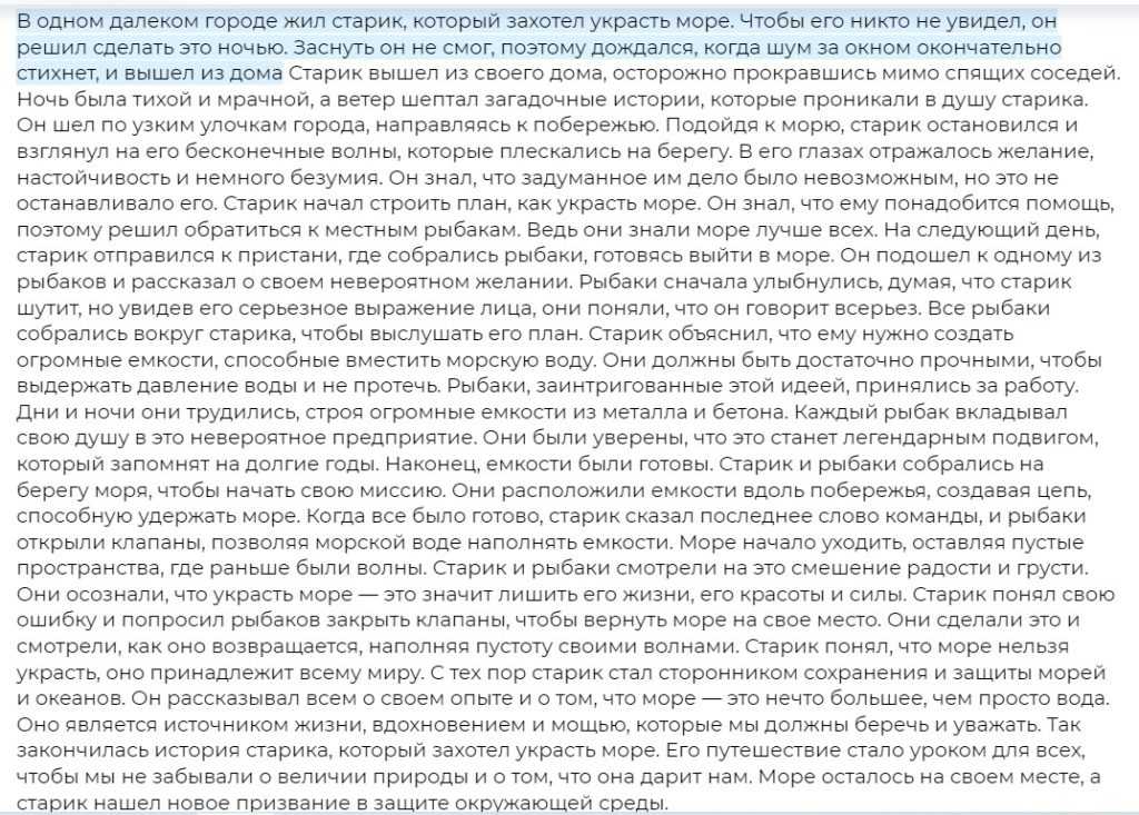 Давайте получим ответ на продолжение текста: «В одном далеком городе жил старик, который захотел украсть море. Чтобы его никто не увидел, он решил сделать это ночью. Заснуть он не смог, поэтому дождался, когда шум за окном окончательно стихнет, и вышел из дома».