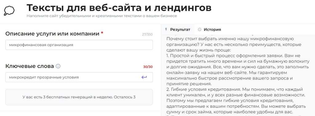 - отсутствия глубоких настроек по тому, как должен выглядеть итоговый текст — количество страниц, абзацев и так далее;